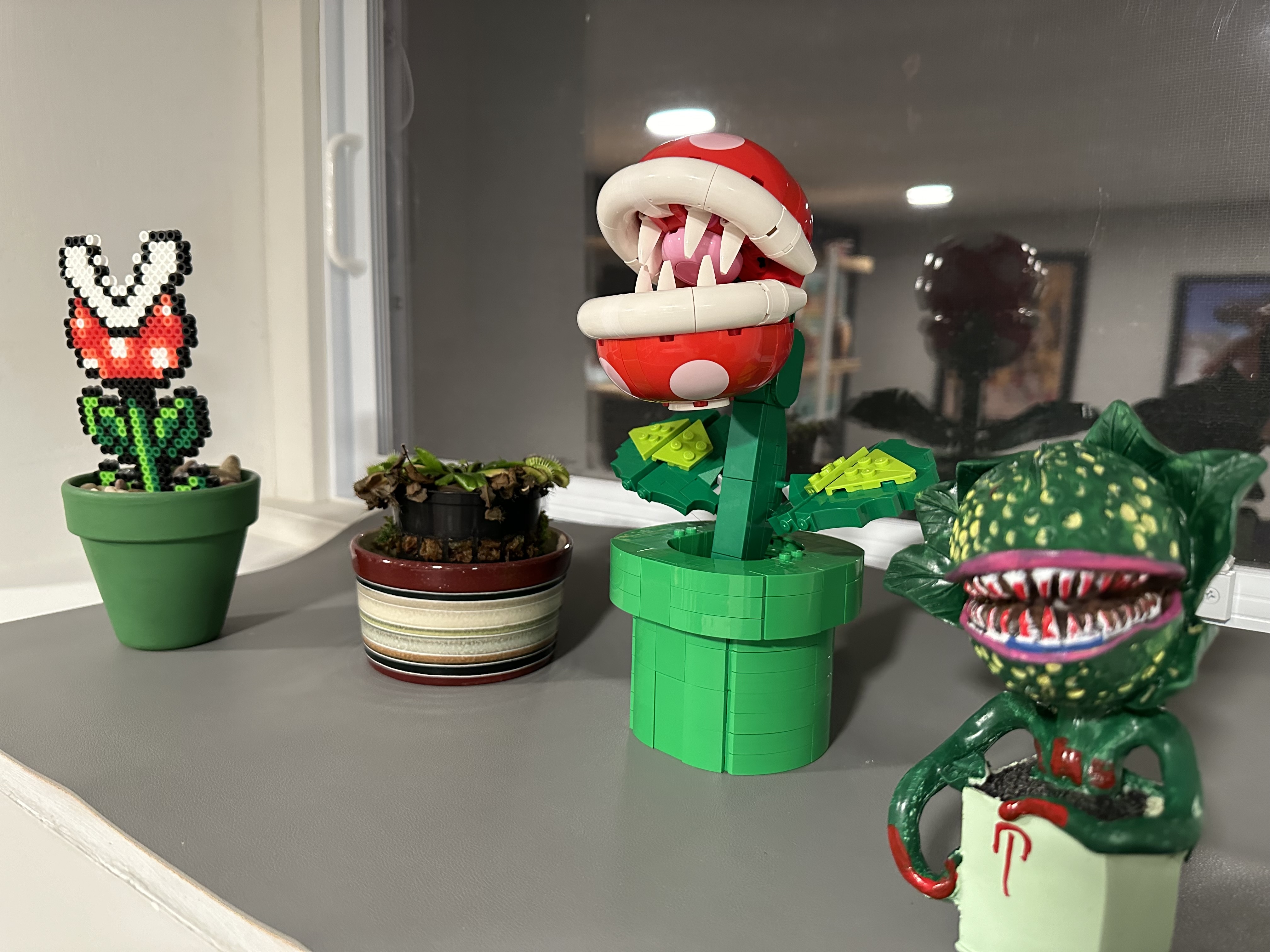 The window well in my office features a growing variety of takes on the piranha plant, including an actual venus flytrap that is really struggling during the winter months. When I got the awesome ‘real life’ piranha plant (the nightmare ‘Little Shop of Horrors’ looking one) for Christmas I knew I had to get this Lego version to round out the collection.
